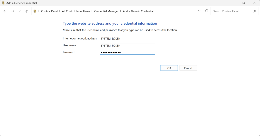 3. Add a generic credential for every secret you are using: Set the value of both Internet or network address and User name to the name of the secret (same as in the Rublon Auth Proxy config file). Then set the Password to the value of the secret you want to store.