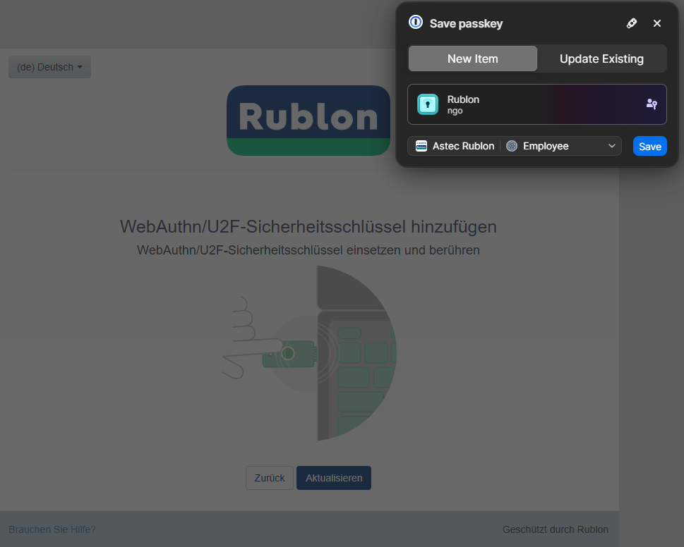 Das folgende Beispiel zeigt, wie Sie einen softwaregebundenen Passkey mit Rublon MFA unter Verwendung von 1Password erstellen und registrieren. Sie können auch einen anderen Passkey-Manager verwenden.