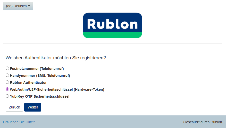 1. Um sich mit Ihrem hardwaregebundenen Passkey anzumelden, wählen Sie im Rublon Prompt die Authentifizierungsmethode WebAuthn/U2F Sicherheitsschlüssel aus.