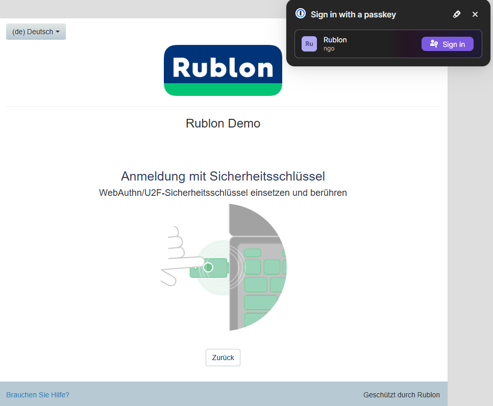 5. Sie werden zum Rublon Prompt weitergeleitet. Sie können sich nun mit Ihrem Passkey anmelden.