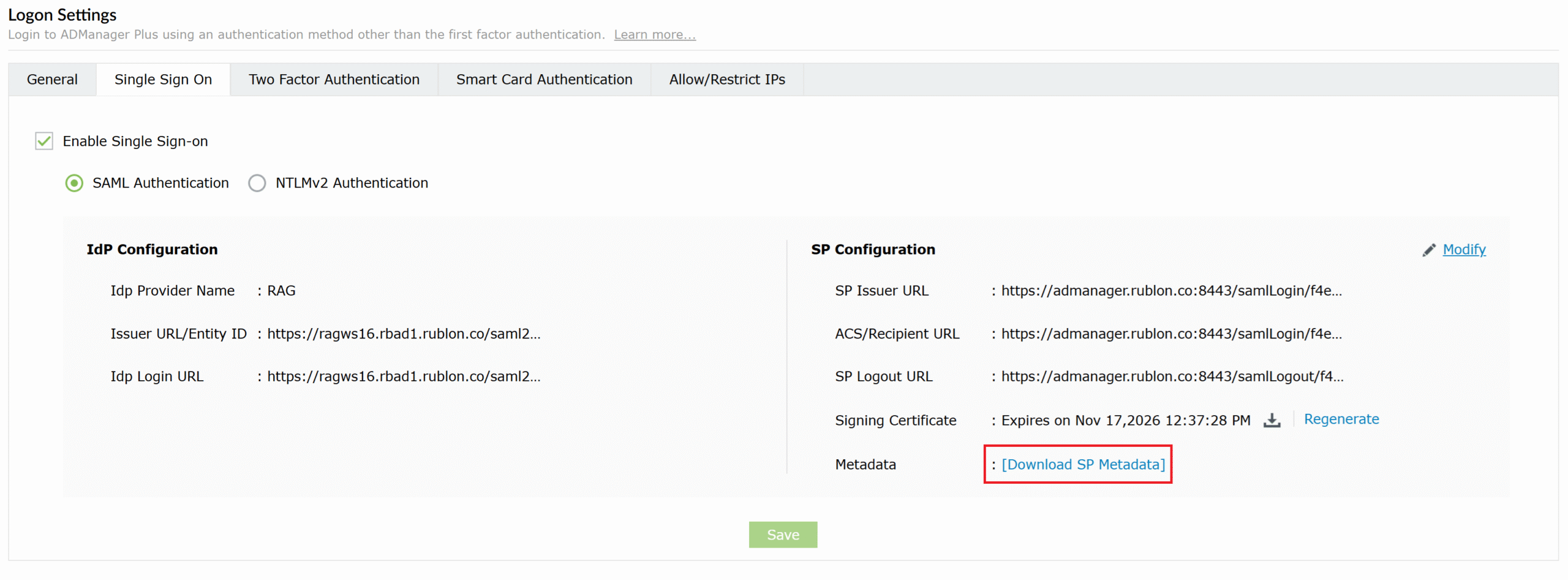 Note: ADManager Plus does not pass the settings from Advanced Settings to the sp_metadata.xml file, hence the need to make these adjustments.