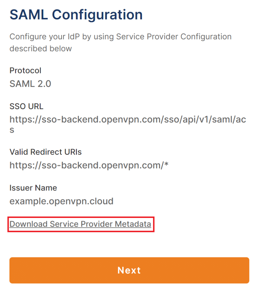 10. Get back to the OpenVPN admin panel. Open the XML metadata file you have downloaded and paste the contents of that metadata file in IdP Metadata XML.