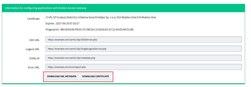 9. Click DOWNLOAD XML METADATA in the Information for configuring applications with Rublon Access Gateway section.