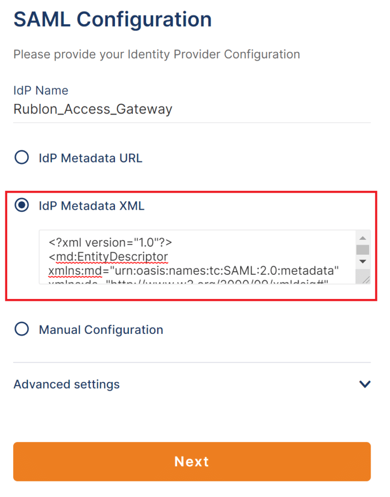 5. Set a name for your idP configuration, e.g. Rublon_Access_Gateway. This configuration will be used for SAML Authentication.