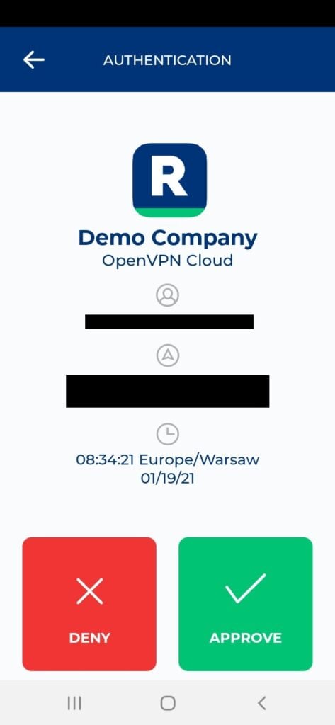 Multi-Factor Authentication (MFA) for OpenVPN Cloud is an additional security measure requiring users to provide two verification elements in order to access OpenVPN Cloud. The first element involves entering an Active Directory / RADIUS username and password. Once entering the correct credentials, the user must perform secondary authentication using one of the available authentication methods such as a Mobile Push or Email Link. After both steps have been completed, the user successfully gains access to the resource. Multi-Factor Authentication (MFA) for OpenVPN Cloud prevents malicious actors from compromising the VPN even when they know the user’s login credentials.
