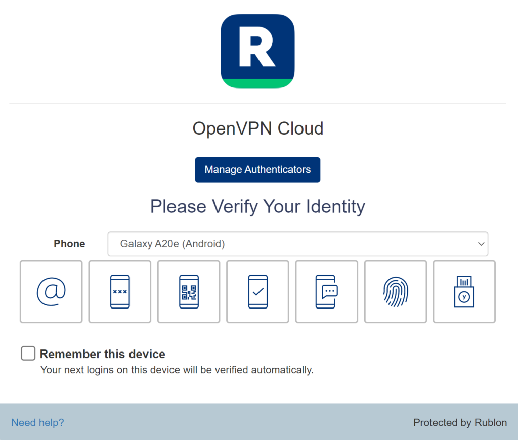 3. Provide your username and password. Click SIGN IN. Rublon Prompt will appear with a selection of various authentication methods from Rublon. Let’s choose Mobile Push.