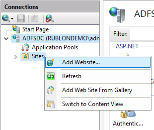 12. Create a Website for Rublon Access Gateway. Right-click the Sites submenu in IIS Manager, and choose Add Website…