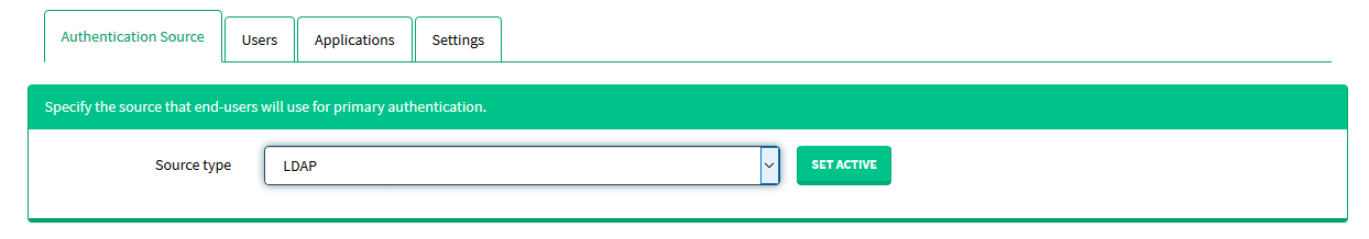1. Select the Authentication Source tab, and ensure Microsoft Active Directory is the chosen source in the Source type dropdown. If not, select Microsoft Active Directory as the Source type, and click SET ACTIVE to save the change.
