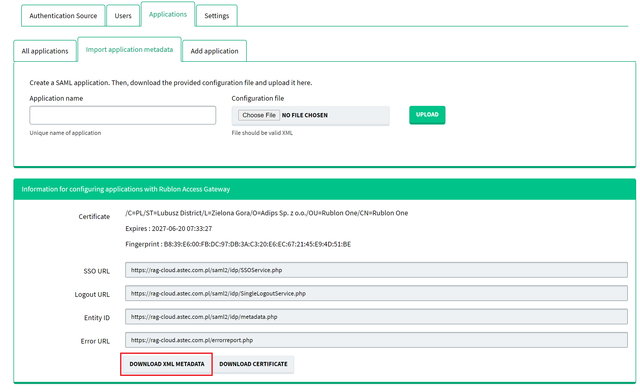 The Applications tab allows you to download XML metadata and the Rublon Access Gateway certificate, display all applications, and add or remove an application.