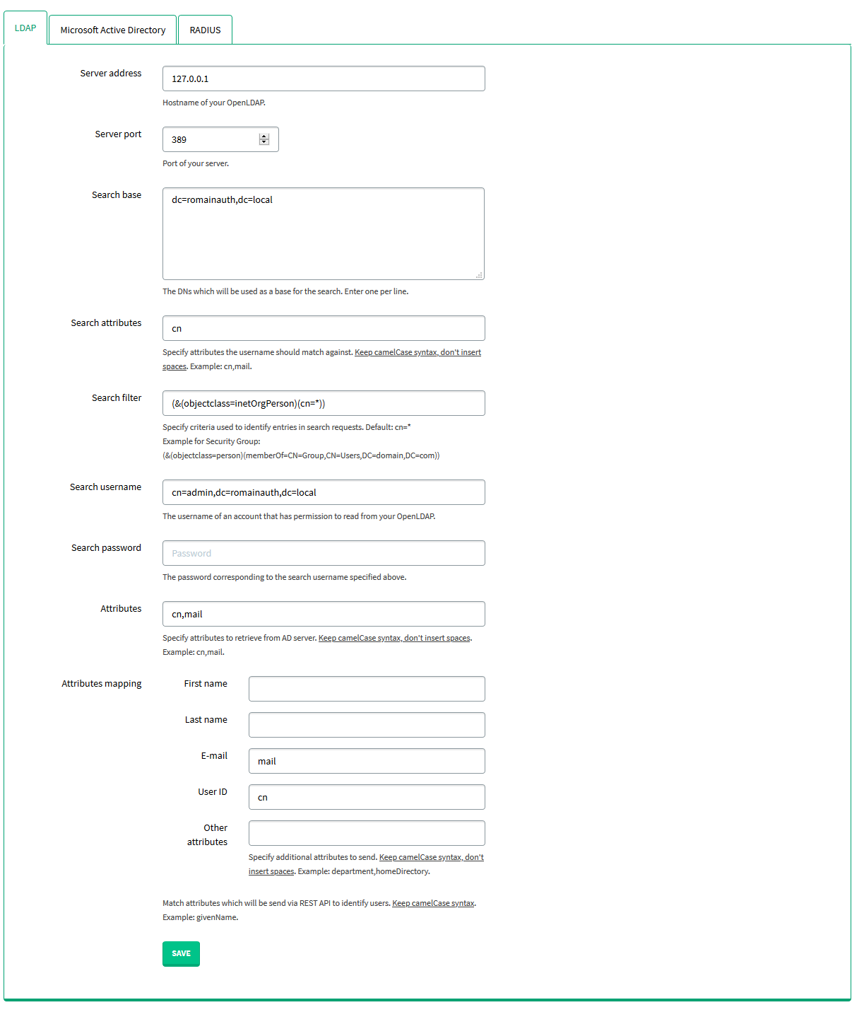 | Attributes mapping | Match attributes, which will be sent via REST API to identify users. Stick to the camelCase syntax and do not use spaces, e.g. givenName, department, homeDirectory. |