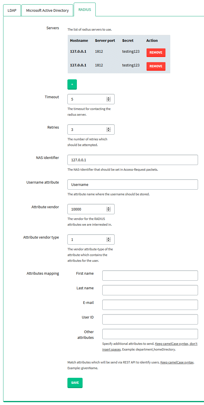 | Servers | The list of RADIUS servers to use. Clicking the green + (plus sign) button opens a form that asks you to specify the address and port of your RADIUS server as well as the RADIUS Secret. Clicking the ADD SERVER button adds the server to the Servers list. |