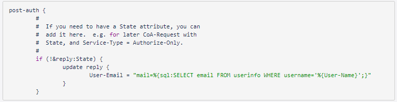 In addition to the above change, you should also modify /etc/raddb/sites-enabled/default. It is possible only after obtaining administrative privileges (sudo command). This change concerns additionally returning the email address to the RADIUS server after successful authentication. By default, the server returns only the User-Name field, which is not sufficient in the CORE context.