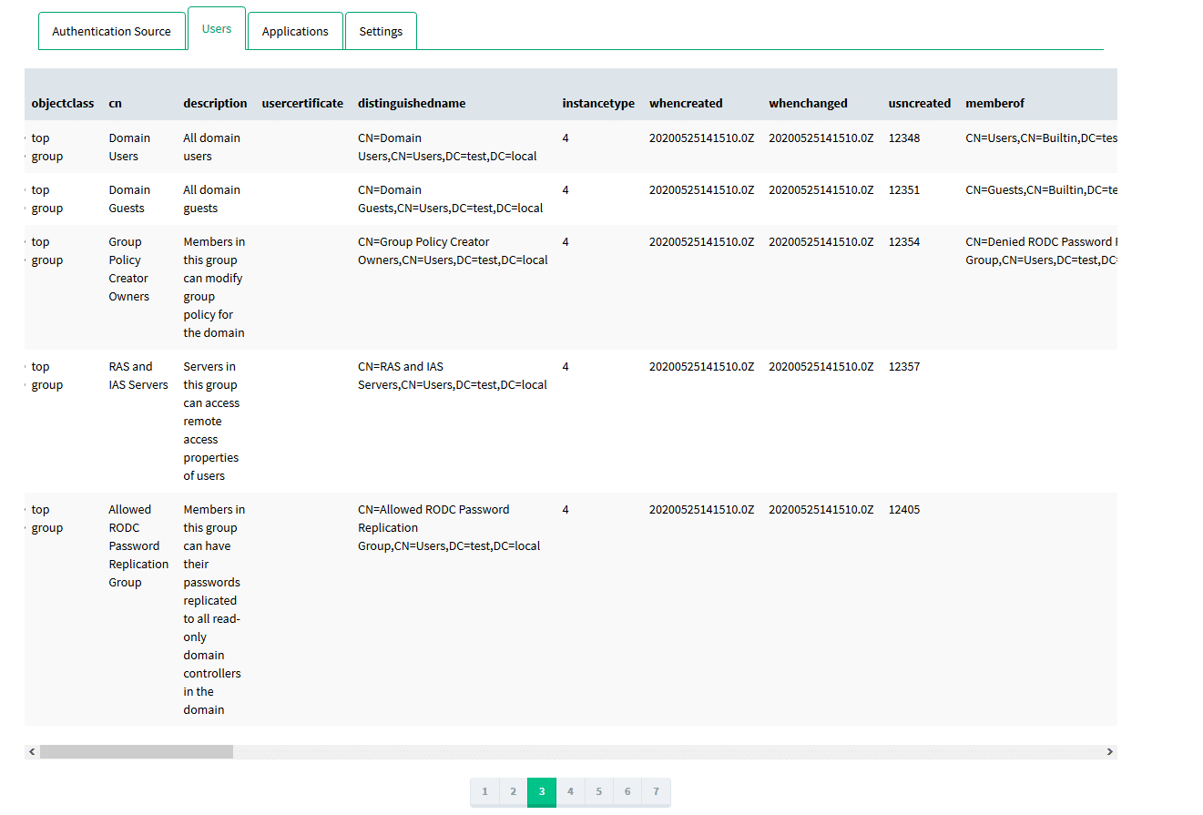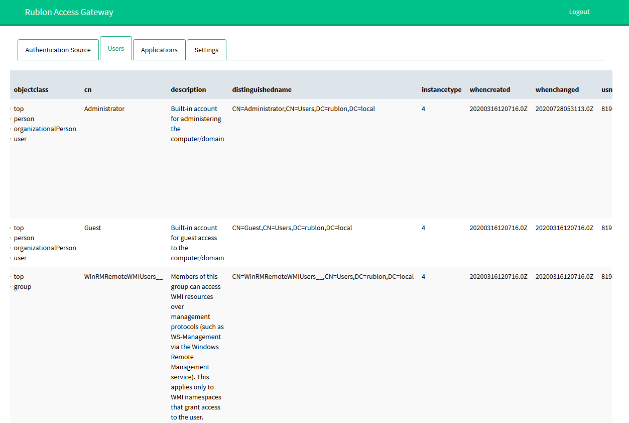 The Users tab shows a list of users with all attributes fetched from the defined authentication source. Users tab is not supported for RADIUS authentication source, because in order to fetch the full list, Rublon Access Gateway would need to have direct access to the RADIUS database, which is impossible due to security risks.