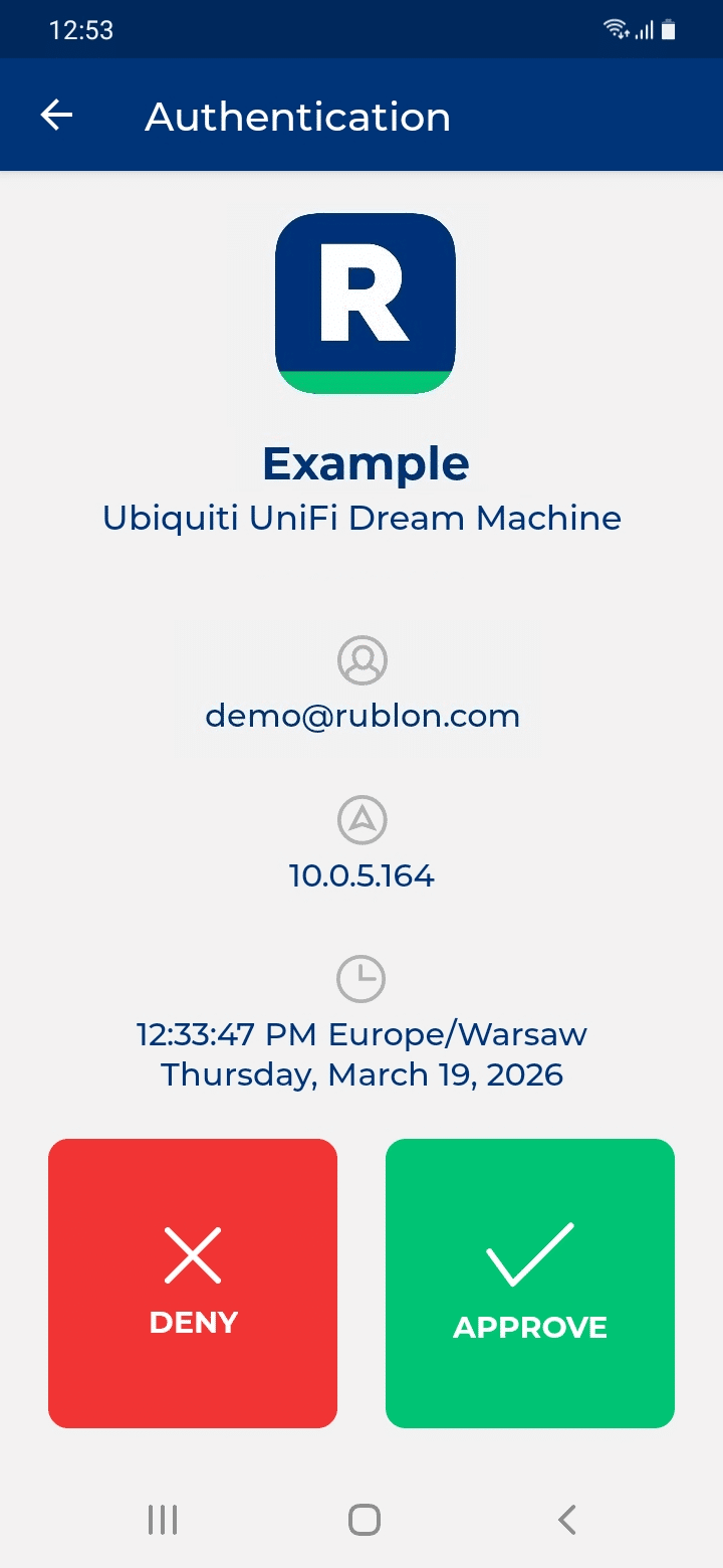 Rublon Multi-Factor Authentication (MFA) for Ubiquiti UniFi Dream Machine (UDM) adds an extra layer of protection, ensuring that only authorized users can access the system. Ubiquiti UniFi Dream Machine MFA enforces both primary authentication (username and password) and a secondary method, such as Mobile Push, to ensure that access is granted only to verified users through a layered security approach.