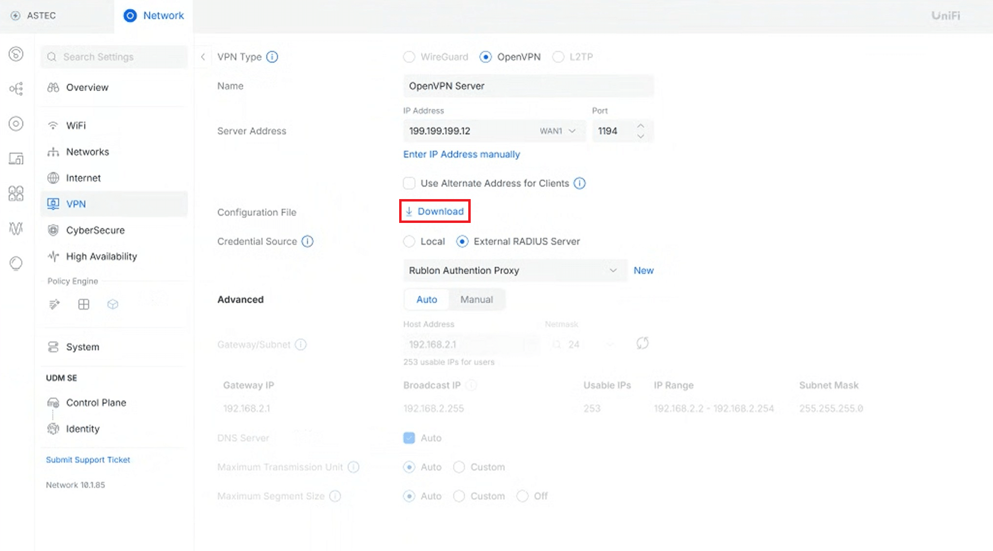 6. After the configuration is saved, select Download to download the OpenVPN configuration file. This file will be imported into the OpenVPN client later when testing the OpenVPN configuration for Dream Machine MFA.
