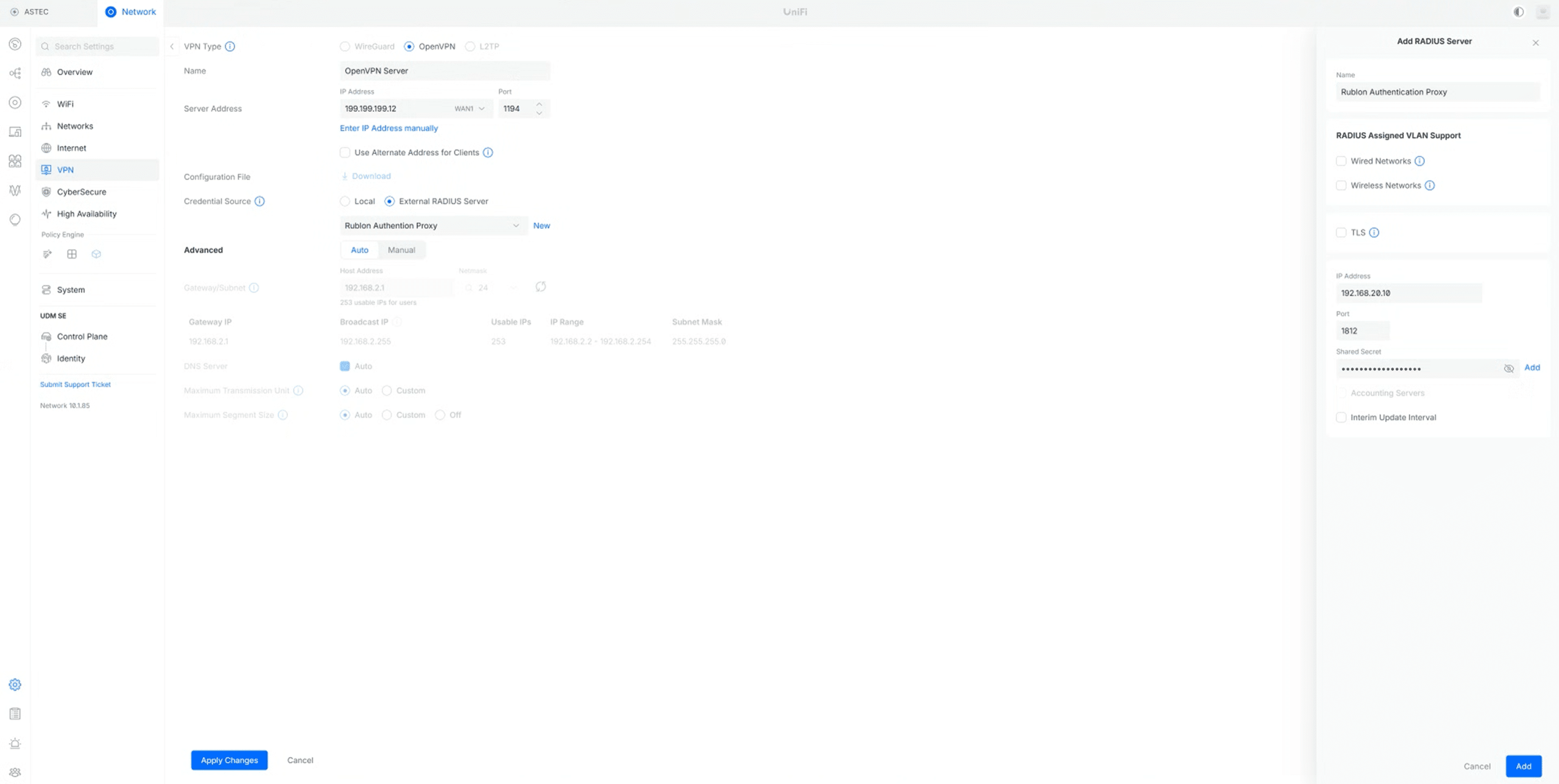 This documentation was validated on UniFi Dream Machine SE (UDM-SE). The same general RADIUS and VPN workflow also applies to other UniFi Dream Machine deployments, although menu labels and available options may vary depending on the Dream Machine model and the UniFi software version running on it.