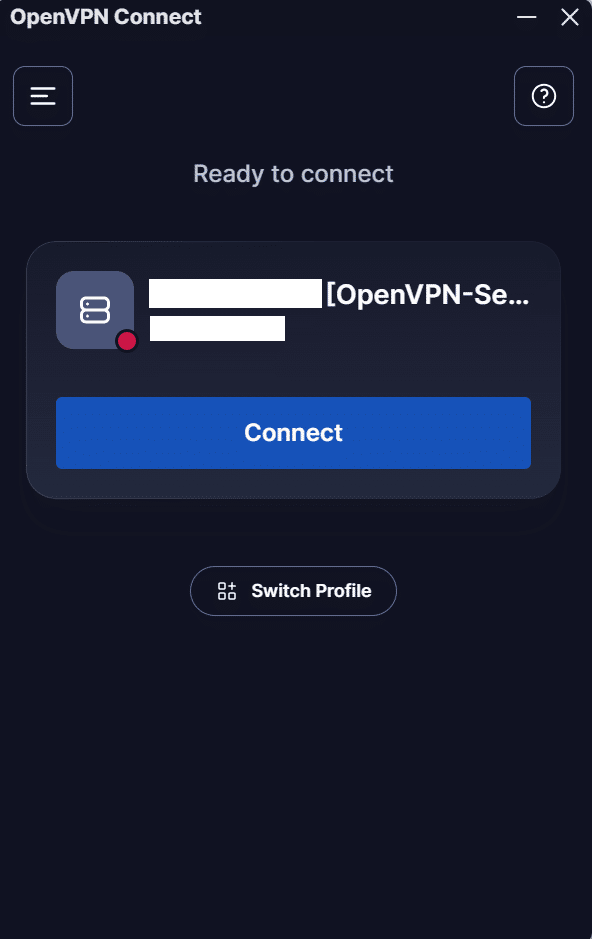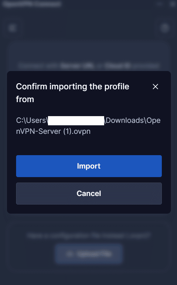1. Open the OpenVPN client, select Upload File, and upload the OpenVPN configuration file you have downloaded during configuration.