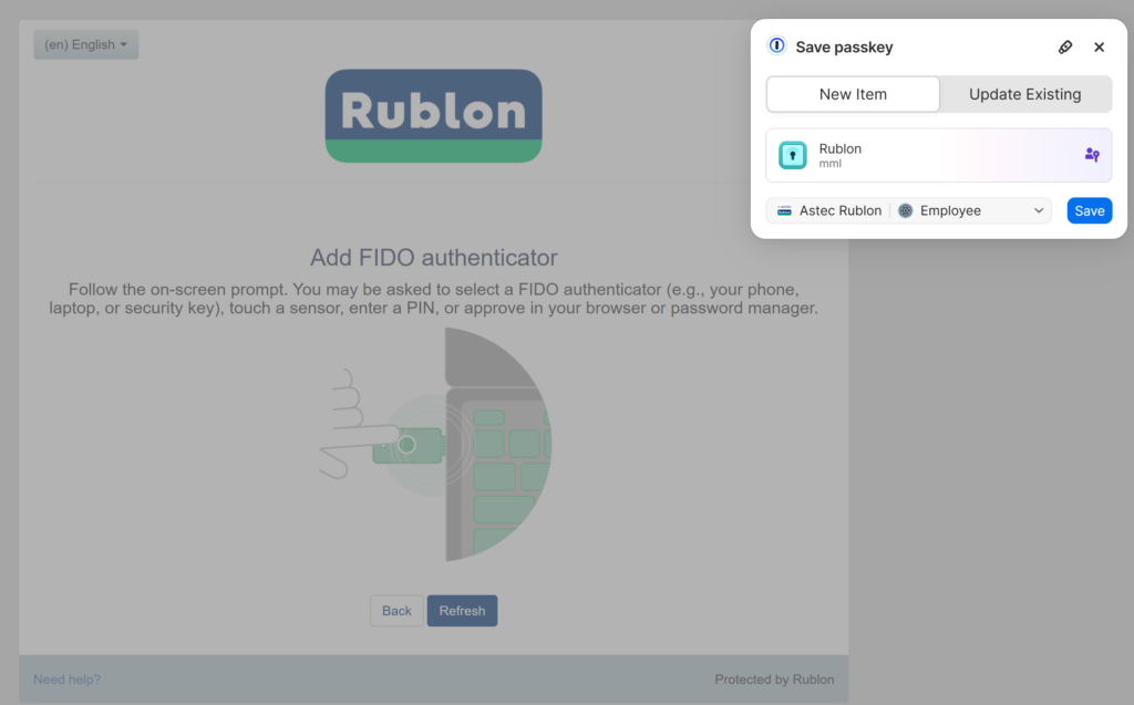 The following example illustrates creating and enrolling a software-bound passkey with Rublon MFA using 1Password. You can use any other Passkey Manager.