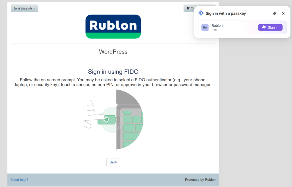 5. You will be redirected to the Rublon Prompt. You can now sign in using your passkey.