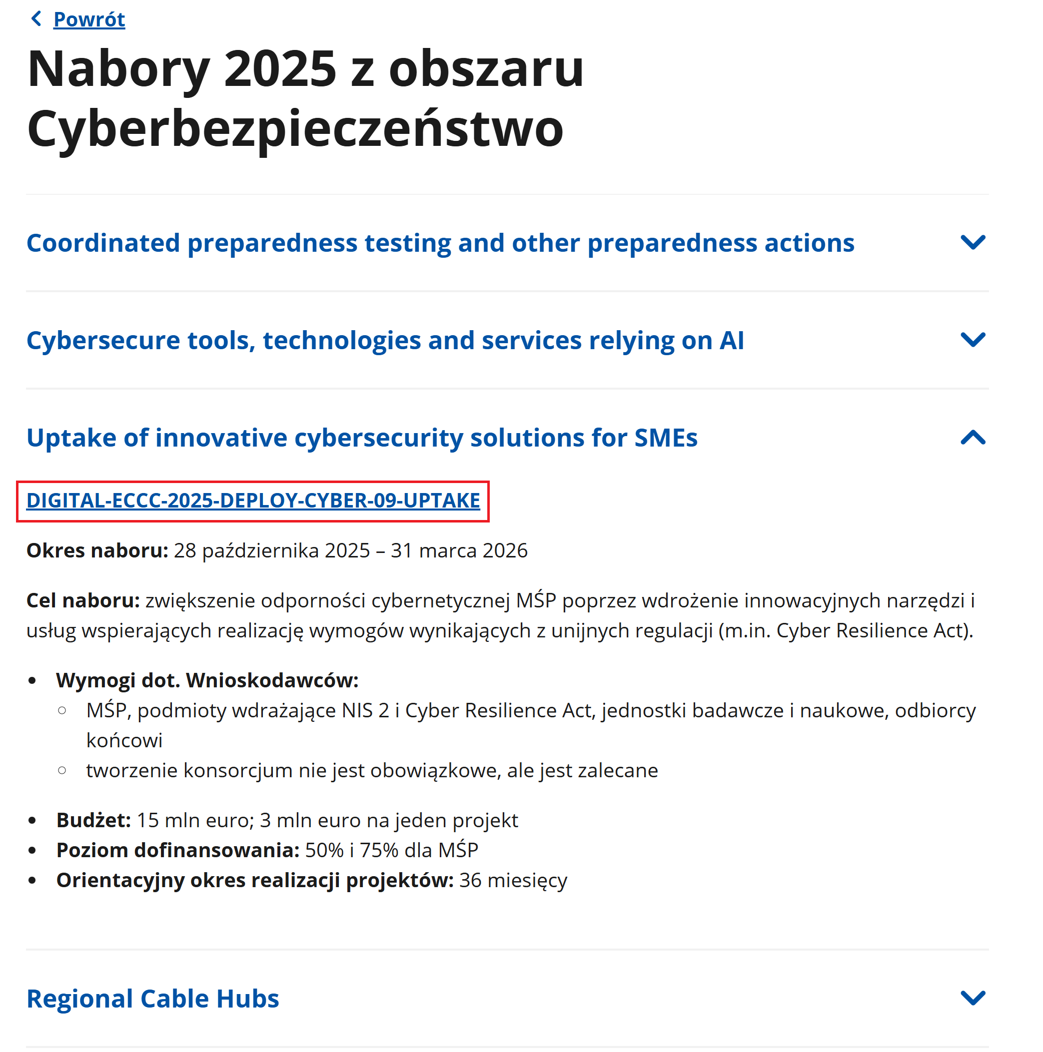 | Uptake of innovative cybersecurity solutions for SMEs (UPTAKE) | Zwiększenie odporności cybernetycznej MŚP | MŚP, jednostki wdrażające NIS2/CRA | 15 mln EUR; 50–75% |