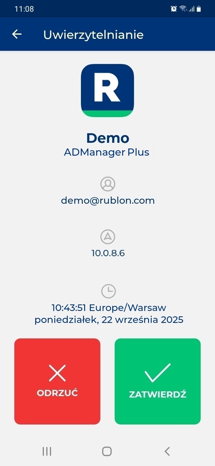 4. Rublon MFA wyśle na Twój telefon żądanie uwierzytelnienia w postaci powiadomienia mobilnego. Wybierz ZATWIERDŹ.