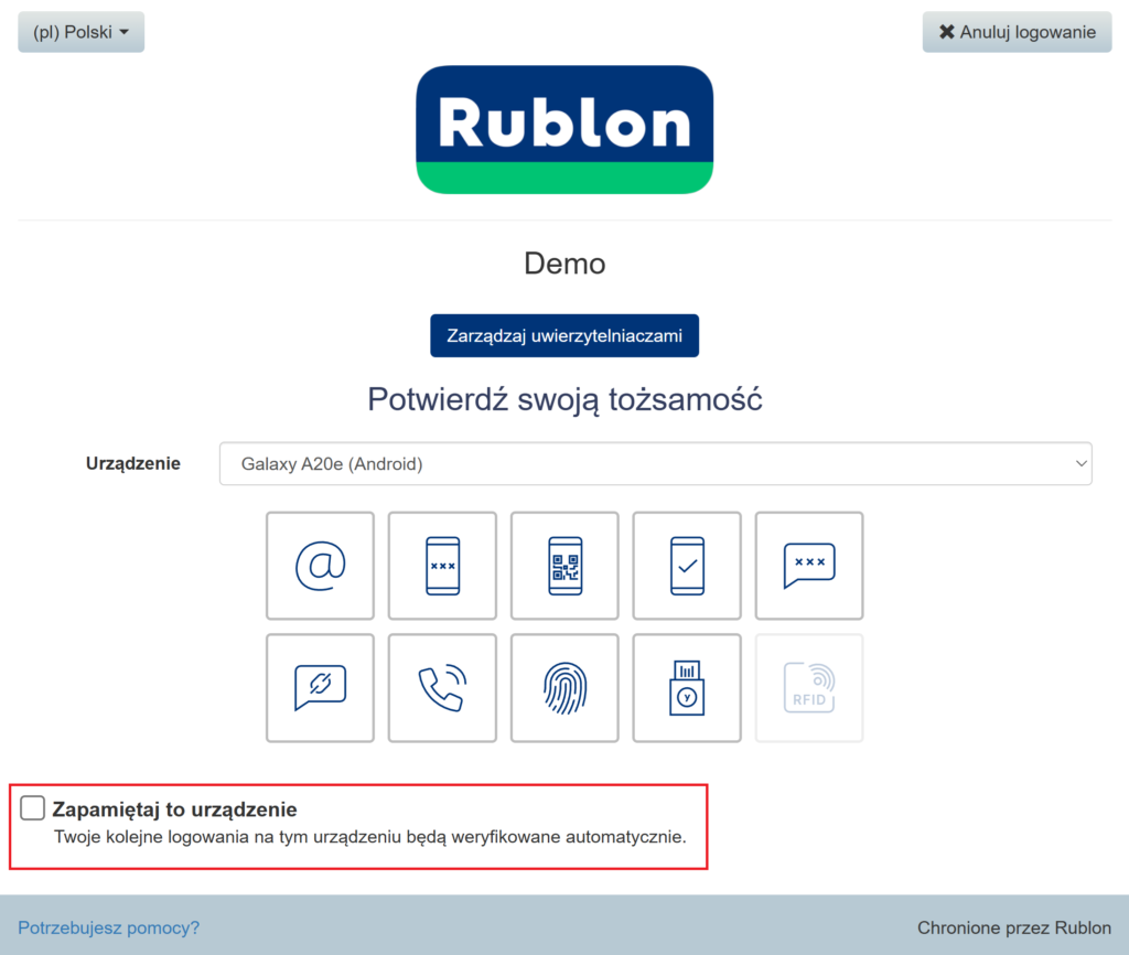 1. System Rublon pyta, czy użytkownik chce zapamiętać dane urządzenie.