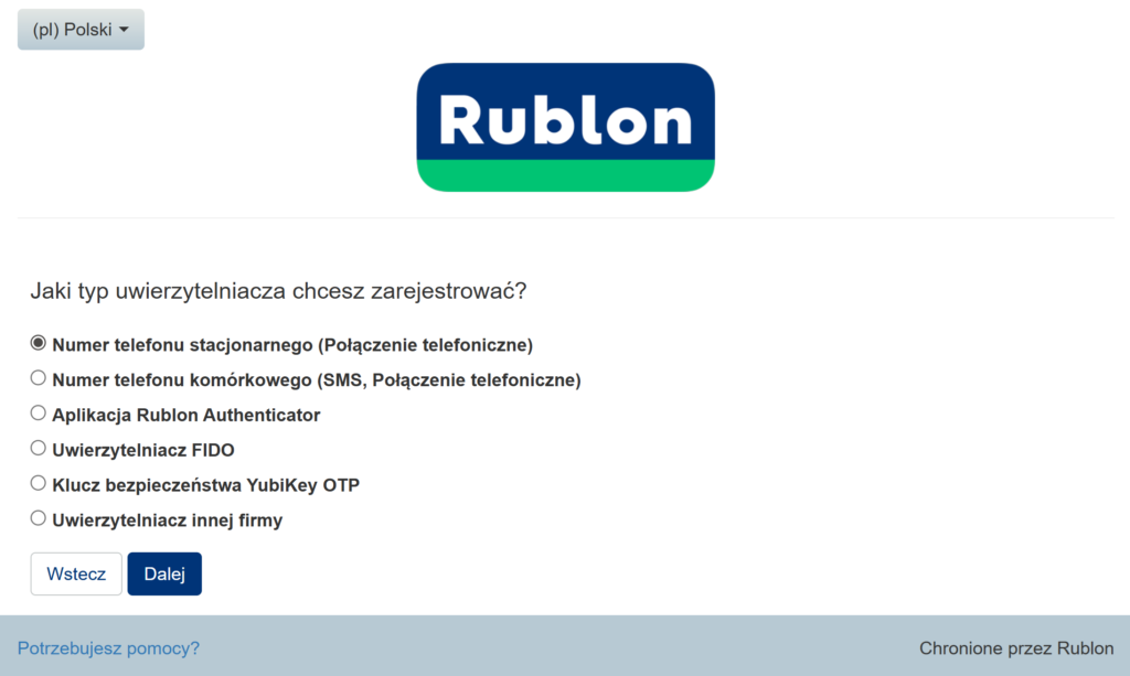 8. Wybierz Numer telefonu stacjonarnego (Połączenie telefoniczne) jako typ swojego uwierzytelniacza i kliknij Dalej.