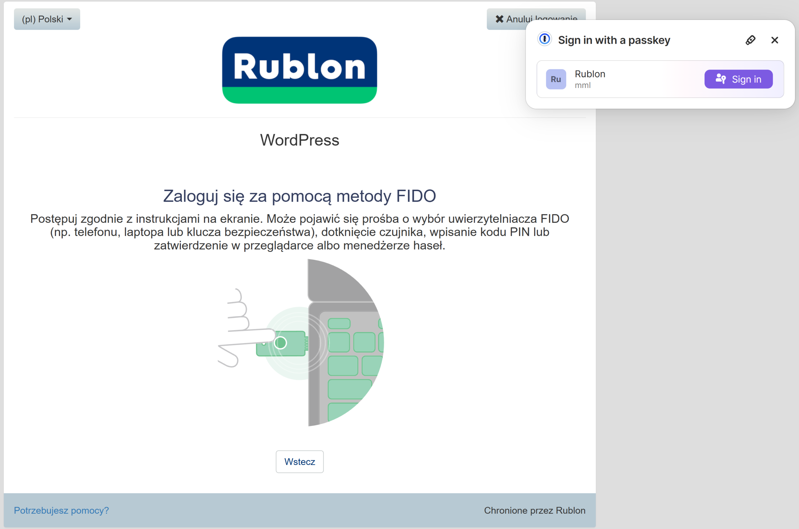 4. Nastąpi przekierowanie do widoku Rublon Prompt. Możesz teraz zalogować się przy użyciu klucza passkey.