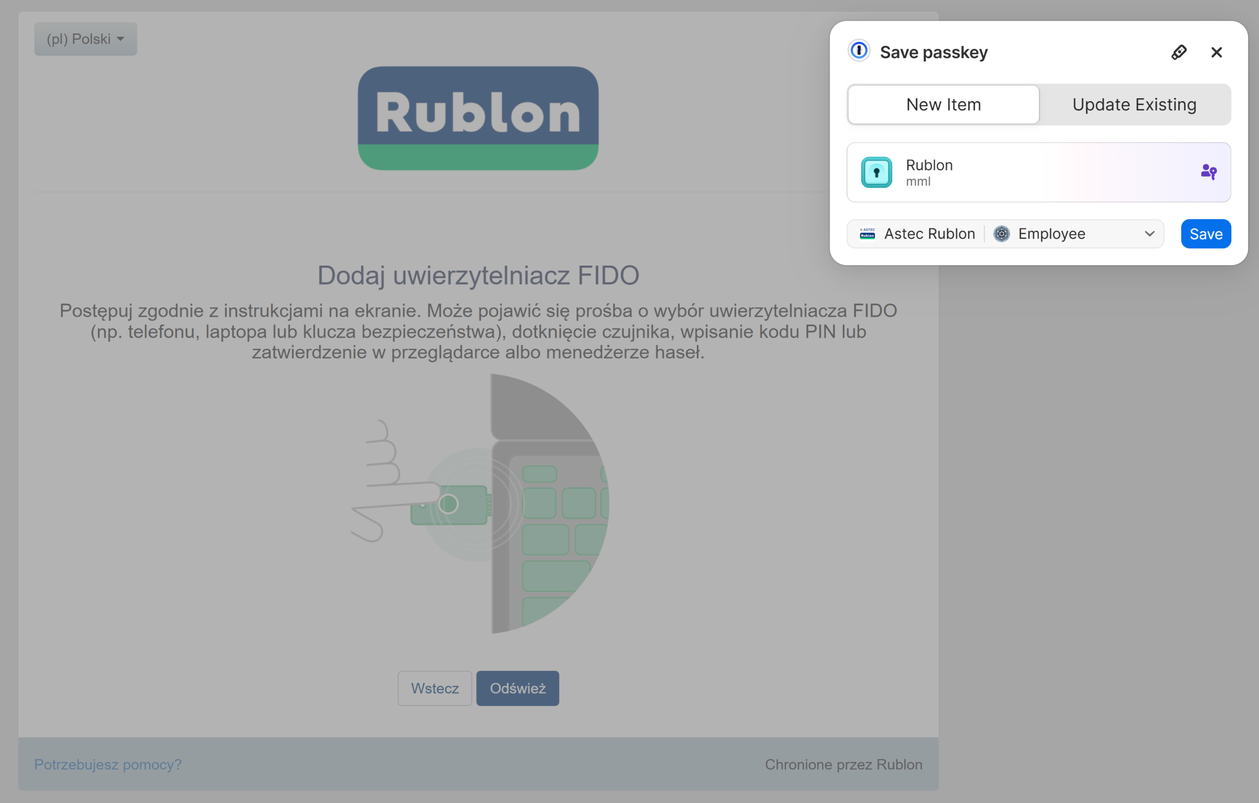 Poniższy przykład ilustruje utworzenie i zarejestrowanie programowego klucza dostępu (passkey) w platformie Rublon MFA przy użyciu narzędzia 1Password. Możesz użyć dowolnego innego passkey Managera.