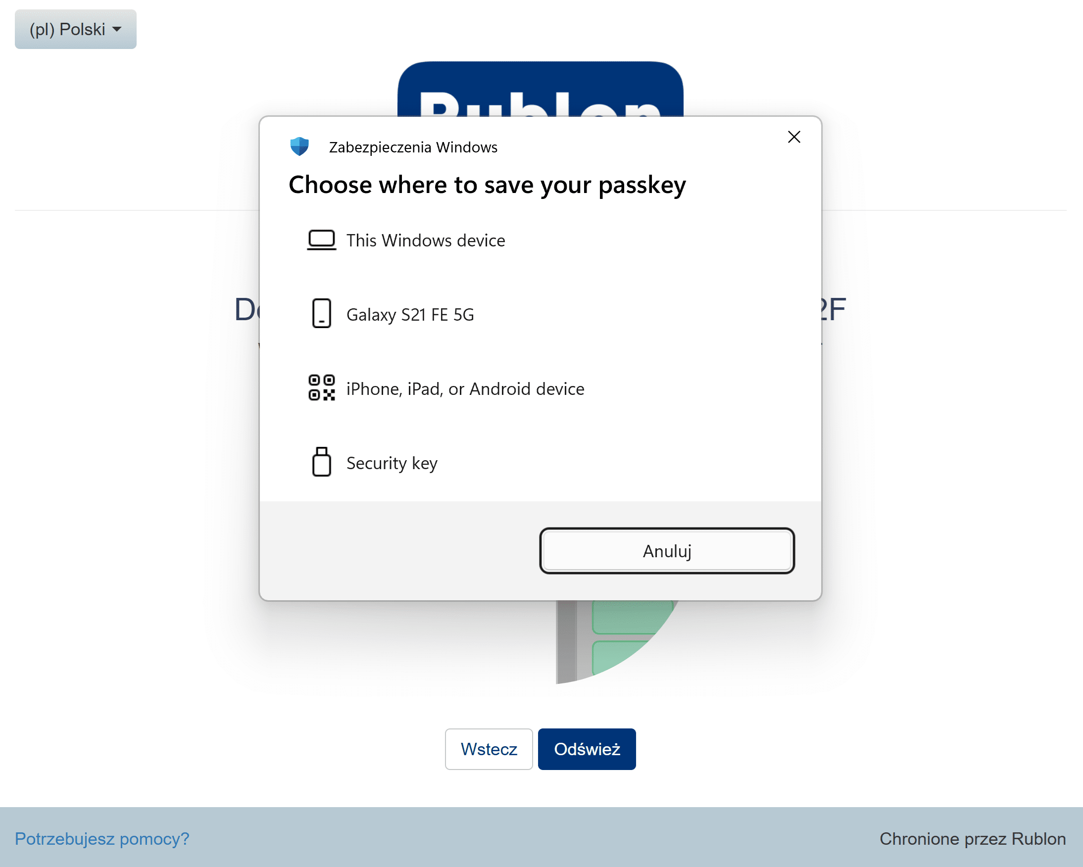 2. Otworzy się okno z prośbą o wybranie urządzenia z zapisanym kluczem dostępu. Wybierz Klucz zabezpieczeń.